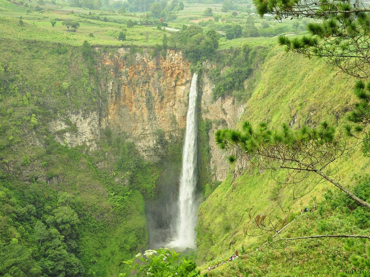 По-соседству с песчаными барханами разных оттенков, красивейший 300-т метровый водопад падает в кратер с вершины, потухшего давным-давно, вулкана.
