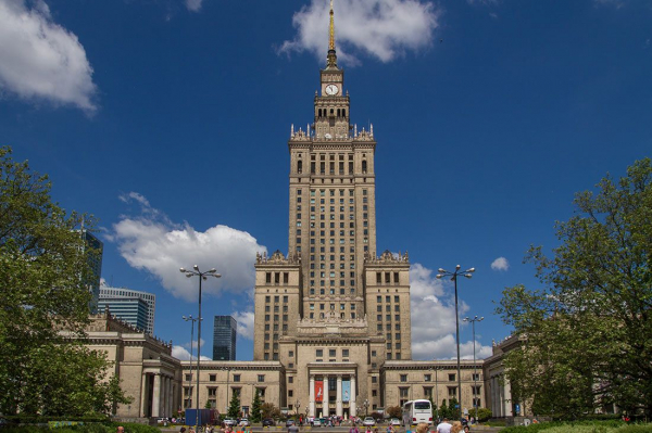 Справа от него находится Варшавский дворец культуры и науки - один из самых высоких небоскрёбов Европы и подарок Сталина. Туристы считают это здание визитной карточкой Варшавы, а многие местные - всего лишь непривлекательным наследие советской эпохи. Высоту много раз хотели снести, однако сегодня в ней находятся офисы, театр, кинотеатр, бассейн, музей и огромный конференц-зал.
