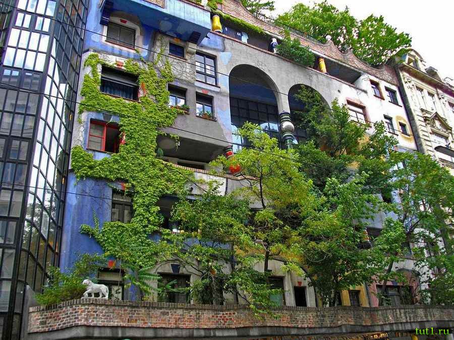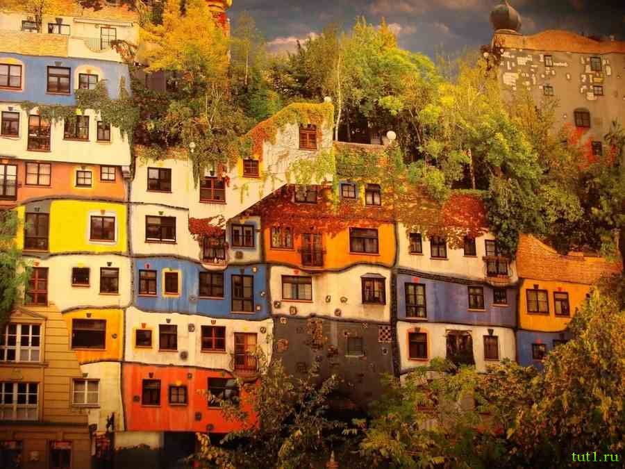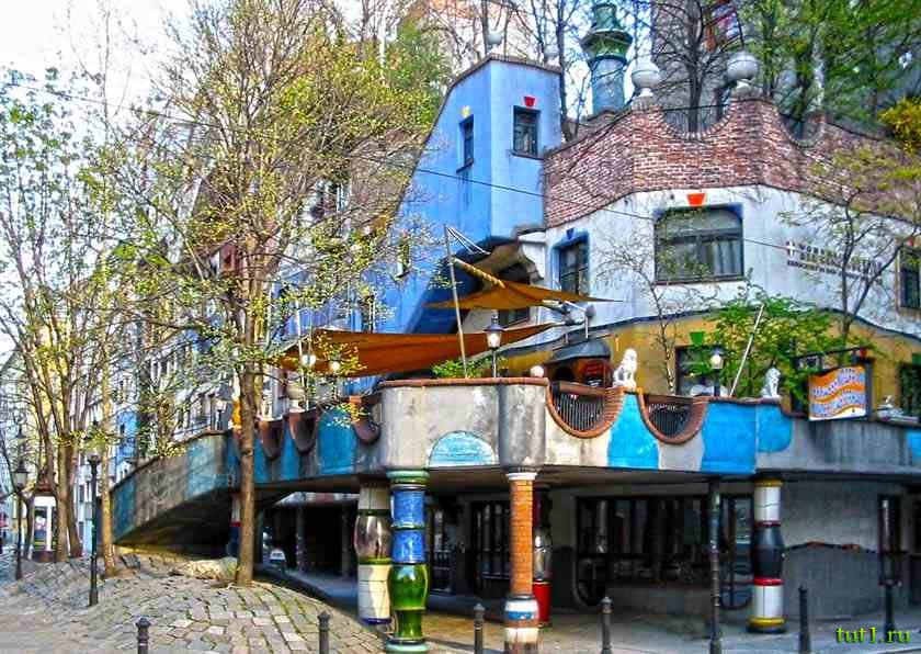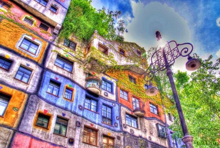Очень любопытный дом находится в Вене. Дом Хундертвассера "Hundertwasser House" ни на что не похож, он единственный в своём роде. Его автором является знаменитый дизайнер, художник поэт и архитектор — Фриденсрайх Хундертвассер. Хундертвассер одна из самых любопытных фигур в австрийской художественной культeре второй половины XX столетия. Он родился в 1928-м году, а умер в 2000-м году (ему было 72 года). Кем же был Хундертвассер? Не так просто ответить на этот вопрос. Он был дизайнером, фантазером, весьма эксцентричным человеком. Эта эксцентричность начинается с его имени — Фриденсрайх Хундертвассер буквально переводится с немецкого языка так: "свободный мир (Фриденсрайх) сто вод (Хундертвассер)." А вообще его звали не так, его настоящее имя Фридрих Штовассер (Стовассер). Дело в том, что фамилия Стовассер переводится как "стоячая вода" то есть — болото. Не хотел он жить с такой фамилией, он узнал, что по-русски "сто" означает 100, перевел это на немецкий и получилось Хундертвассер. Весьма пышный псевдоним сочинил себе этот человек. Работал он в Австрии, здесь он выдвигал свои идеи, здесь он "сочинял" дома — иначе не скажешь. А потом он уехал в Новую Зеландию и последние годы жизни жил там. Умер этот неординарный человек на пароходе — путешествуя из Новой Зеландии в Европу.