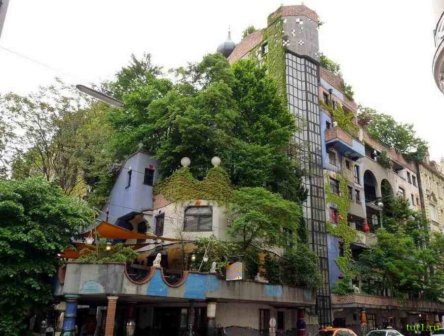 Естественно, булыжная мостовая возле дома холмистая, на крыше растут большие деревья, на болконах растут небольшие деревья и кустарники. Плющ и дикий виноград используются для украшения дома. Хундертвассер говорил, что дом надо не строить, а выращивать.