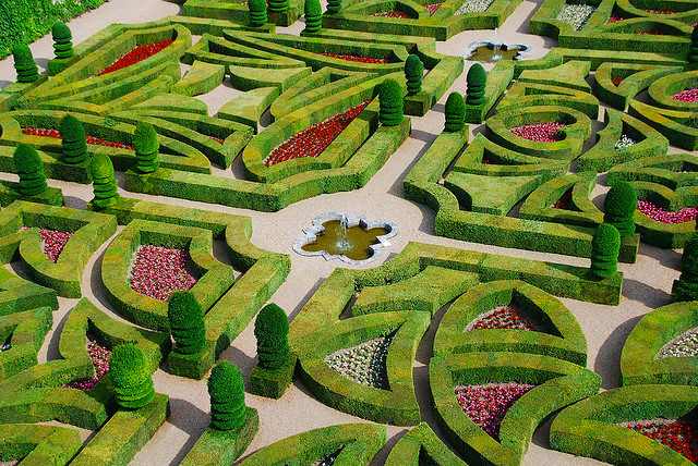 Самый верхний уровень — с замечательным прудом, фруктовыми деревьями, клумбами. Вода из пруда поступает в фонтаны нижних уровней. Его же водой пользуется и сам дворец. На нижнем уровне вроде ничего интересного, там раскинулся обычный огород. А вот средний уровень, расположенный вровень с первым этажом — сад любви. В декоративном саду расположены подстриженные кустарники, символизирующие четыре характера любви — нежную, мимолетную, трагическую и страстную.