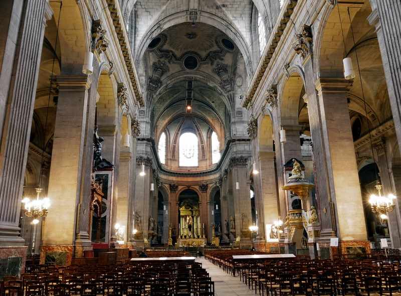 Церковь Сен-Сюльпис — одна из самых больших церквей Парижа. Монументальные ряды колон поддерживают фасад башни, массивные аркады отделяют боковые нефы от центрального. Огромный орган, с пятью клавиатурами и 6 500 трубами гармонично вписывается в массивные размеры внутреннего пространства церкви. На стенах капелл в боковых нефах можно увидеть ценные фрески, изображающие сцены из жизни святых.