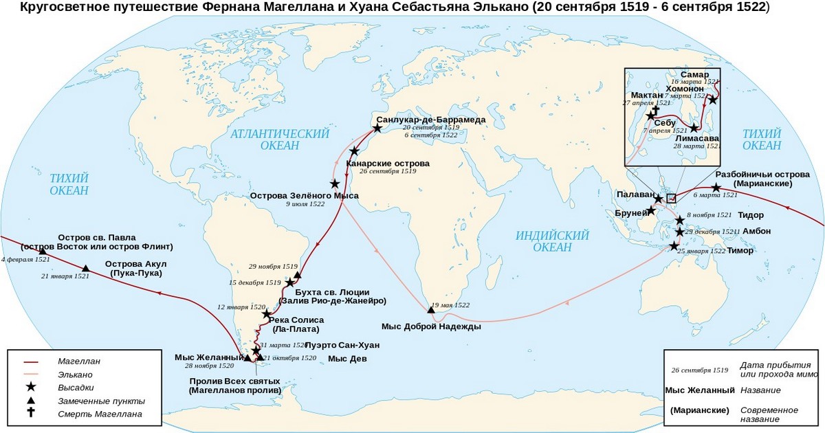 Экспедиция Магеллана открыла западный путь к Азии и, сама того не ожидая, совершила первое кругосветное путешествие. В экспедицию под руководством Фернана Магеллана отправлялось пять кораблей, общее количество участников было около 300 человек. Вернулся в Испанию только один корабль, на котором находилось 18 человек экипажа. Позже с португальской каторги вернулось еще 18 моряков. Средства, полученные от продажи пряностей и золота, которые были в трюмах единственного дошедшего до Испании корабля, полностью покрыли убытки от погибших кораблей и затраты на экспедицию. Более того, Испанская корона оказалась еще и в прибыли.