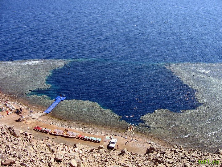 В бухте Дахаба находится знаменитая «Голубая дыра», которая представляет собой пещеру, расположенную под водой. Вертикальная пещера имеет глубину до 100 метров и считается самым опасным местом в мире для погружений с аквалангом. На глубине примерно 50-55 метров между пещерой и морем существует проход, а та часть скал, которая находится над данным проходом, называется аркой. Для ныряльщиков разработан специальный довольно безопасный маршрут, состоящий из погружения, прохождения по длине рифа и вхождение в «голубую дыру» через перешеек, расположенный на глубине около 7 метров. Таким образом, преодолев «голубую дыру» вдоль рифа можно подняться на поверхность, воспользовавшись специальным деревянным мостом. Нехорошую славу этому месту принесли погибшие здесь дайверы, которые нарушали технику безопасности или были неподготовленными и неопытными. Здесь даже возведен памятник погибшим, однако их имена не указываются, чтобы не отпугивать туристов. Однако существуют люди, переплывшие смертельную арку без акваланга на одном вдохе. Среди них стоит отметить Наталью Молчанову — она пока единственная женщина в мире, которая смогла совершить это.