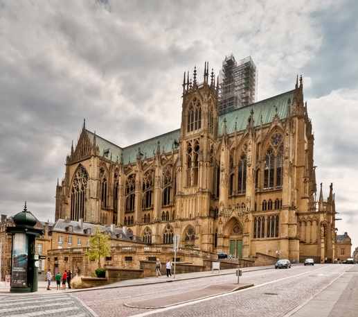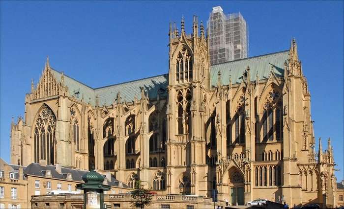 Конечно, всех прибывших в город Мец, непременно, первым делом ведут на кафедральную площадь к главному собору города — Собору Святого Стефана (или просто ‒ Мецский Собор). Он, действительно, грандиозный, величественный и одновременно — ажурный, в своём, сложносочиненном, убранстве.