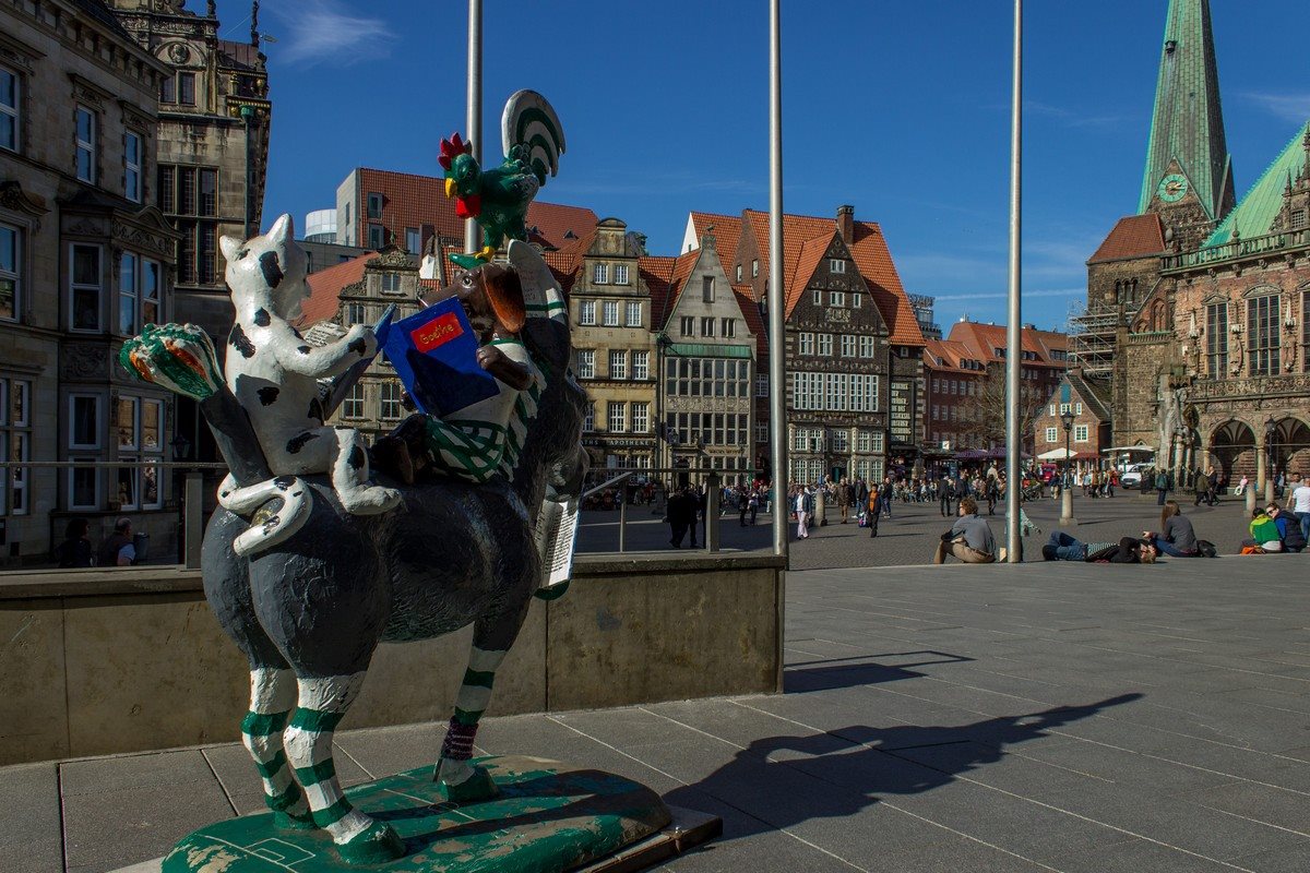 1. Обязательно стоит загадать желание у статуи Бременских музыкантов на рыночной площади и потереть ногу осла, а если дотянетесь – то собаки, кота или даже петуха. Наилучшим квестом станет поиск всех изображений знаменитой звериной четверки, которых в Бремене великое множество.