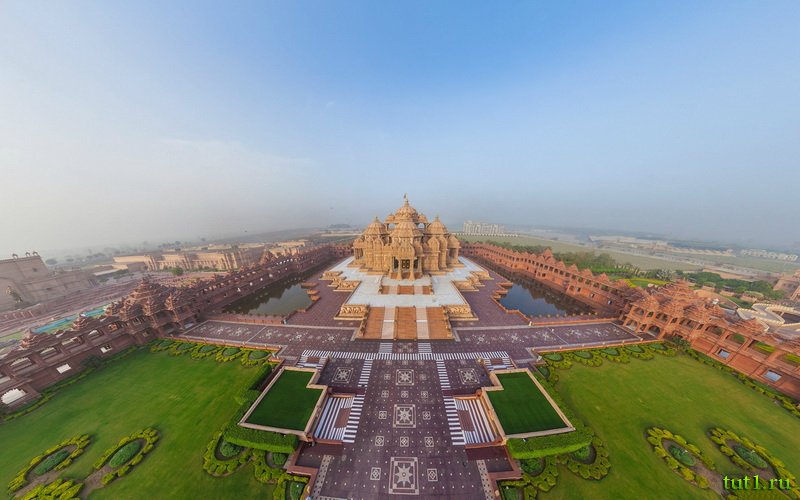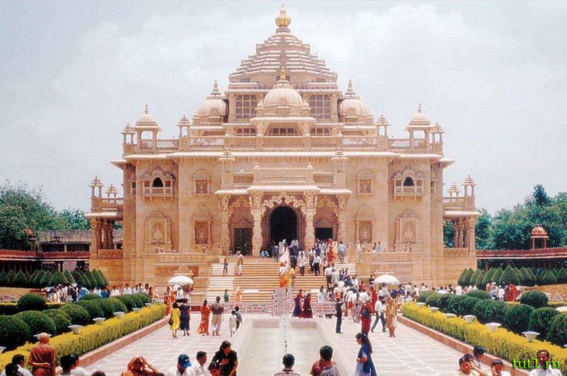 Акшардхам — самый большой индуистский храм в мире. Это сооружение довольно новое — его открыли в 2005 году. Храм возводили за счёт добровольных пожертвований, которые в общей сложности составили 500 миллионов долларов США. Это грандиозное здание достигает в высоту 42 метра, его ширина — 94 метра, а длина — 106 метров. Этот архитектурный комплекс поражает своей роскошью и красотой убранства — его украшают более 20 тысяч скульптур. Так же, храм украшают многочисленные колоны, купола и пирамидальные башни.