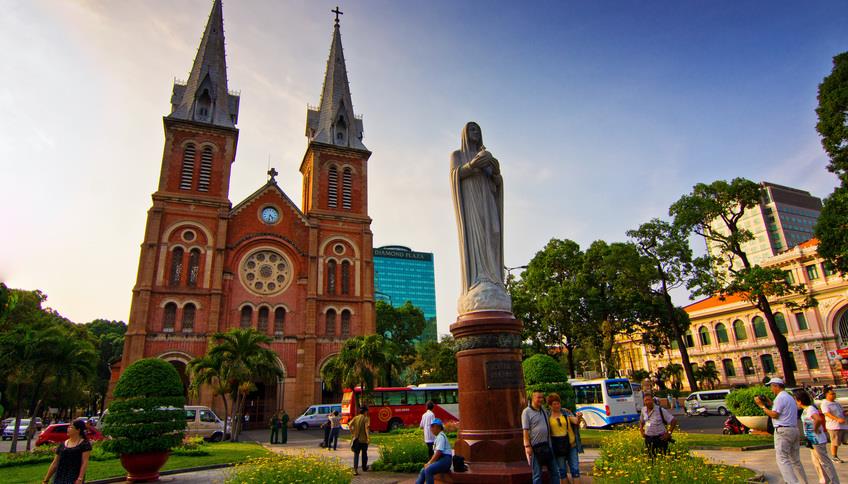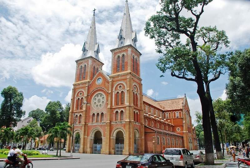 Собор Нотр-Дам в Хошимине был возведен во время французского правления. Сначала построили церковь из дерева (в 1863 году), но через несколько лет она была повреждена нашествием термитов. Тогда решено было возвести христианский собор, который бы затмил все буддийские храмы. При строительстве местные материалы не использовались, а завозились из Европы. Из Марселя был привезен красный кирпич, а из Шартра — прекрасные витражи (большая часть из-за войны была уничтожена). Проект собора принадлежит французскому зодчему (J. Bourad). На возведение храма ушло шесть лет — его возводили с 1877-го по 1883 год. Первоначально его называли Церковью Сайгона, но в 1959 году епископ Фам Ван Тхиен дал собору название Нотр-Дам. В это же время в храме была установлена сделанная из римского гранита статуя. А в 1962 году Ватиканом была произведена церемония помазания и собору даровали звание Базилика.