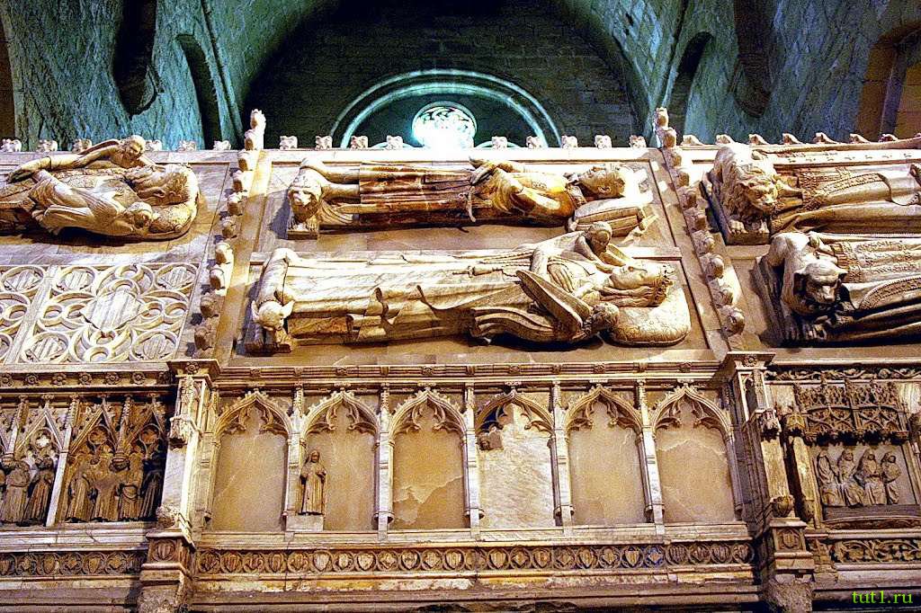 Причем в мраморе выполнены не только короли, но и их супруги. К слову, в ногах у каждой королевы лежит мраморный пес ― символ верности мужу, а у каждого короля покоится лев ― символ власти. Весь этот монументальный ансамбль составляет самую большую группу скульптурных гробниц, выполненных в стиле каталонской готики.