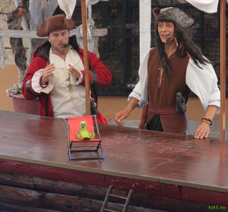 К счастью, помимо шоу дельфинов тоже есть на что посмотреть. Самый новый аттракцион — шоу тропических птиц. Птицы выполняют различные трюки, а два пирата рассказывают о них на испанском и английском. Это одновременно развлекательное и познавательное шоу. Может, эти ребята и уступают в акробатике дельфинам, зато восполняют этот недостаток юмором.